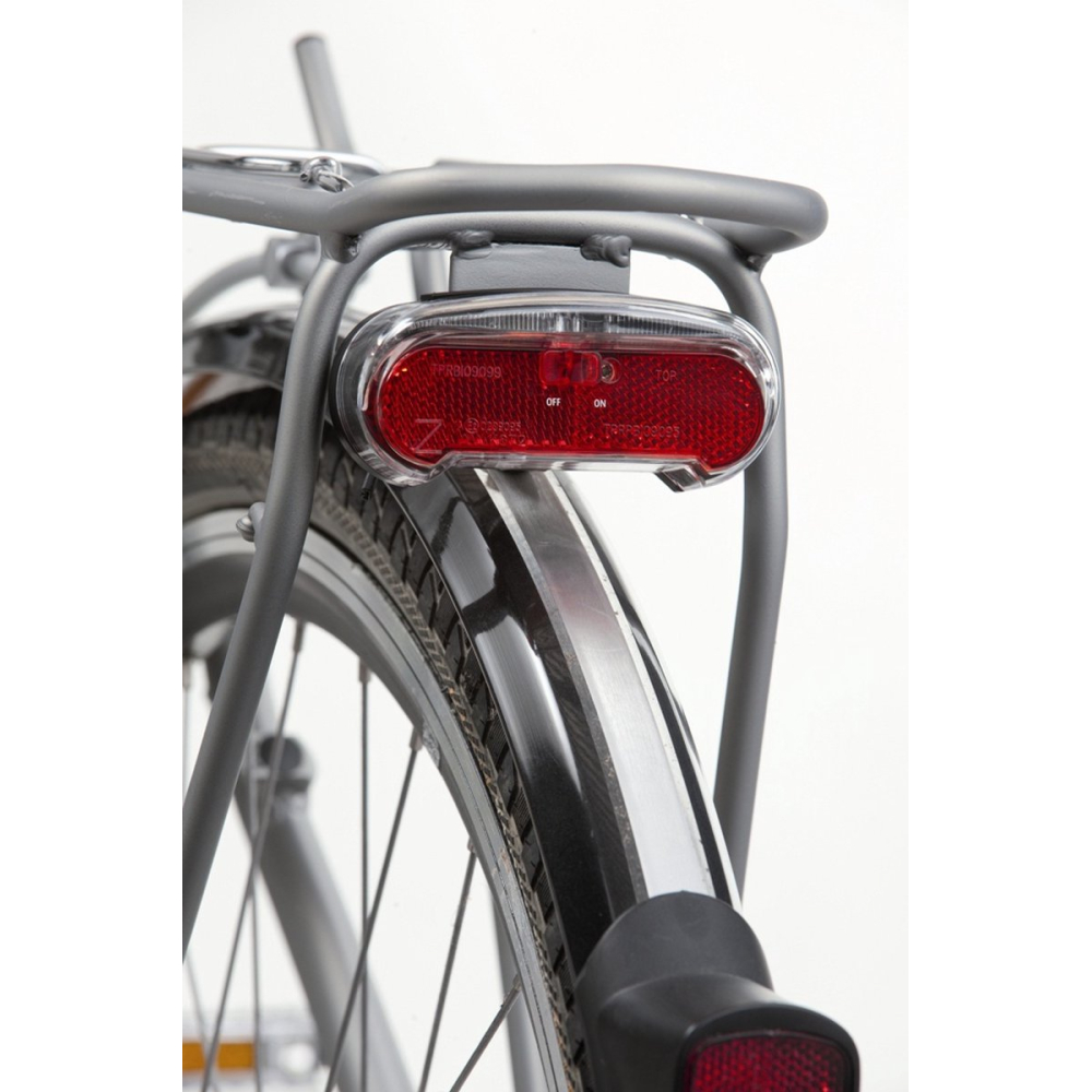 Het achterlicht heeft een makkelijk te bedienen aan/uit schakelaar. Wanneer de (meegeleverde) 2 AAA batterijen bijna op zijn, geeft het achterlicht dit aan. Hierdoor ben je altijd op tijd met vervangen en kun je weer veilig de weg op.