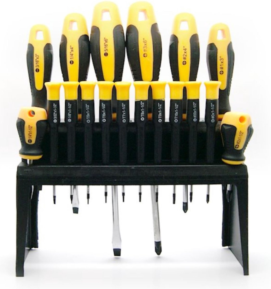 De 18-delige schroevendraaier set bevat schroevendraaiers van uitstekende kwaliteit. De schroevendraaiers zijn vervaardigd uit sterk chroom vanadium staal en beschikken over magnetische punten. Verder zijn de handvatten vervaardigd uit twee componenten antislip materiaal. Op deze manier is er een betere krachtoverbrenging. De set wordt geleverd in een handig wandhouder. Door de wandhouder heeft u alles overzichtelijk in uw garage of werkplaats hangen.